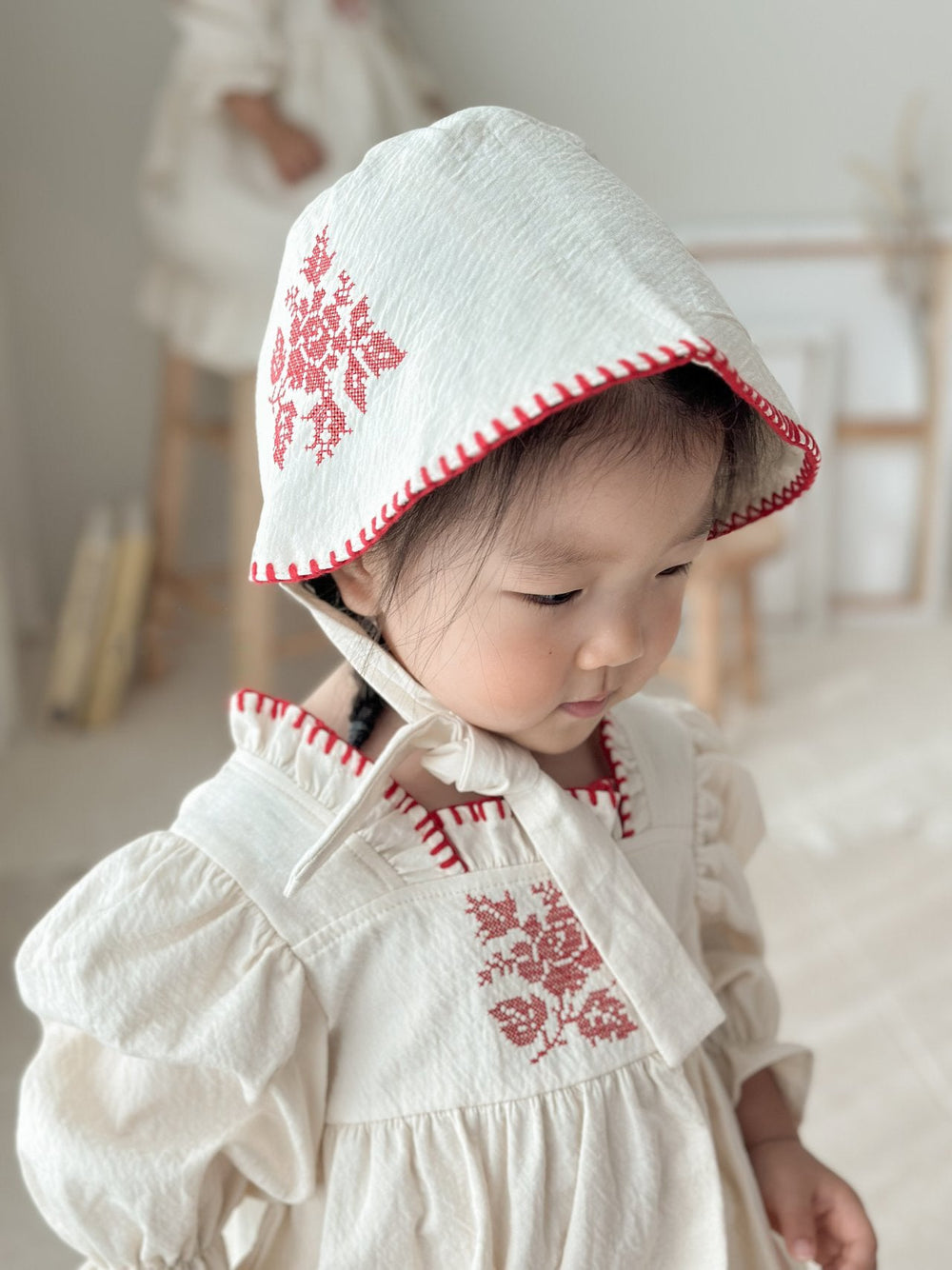 This elegant bonnet features delicate floral embroidery and intricate stitching along the edges, adding unique charm. Pair it with a matching romper or dress for a perfectly coordinated look.