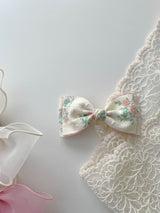 A sweet jacquard bow clip featuring a charming pink floral print.