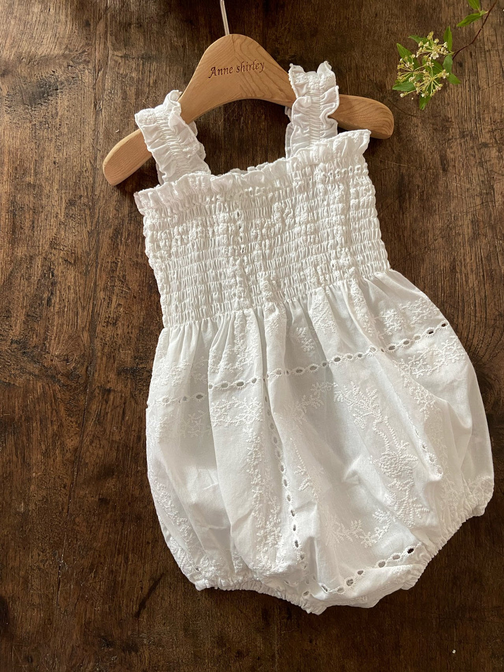 A charming baby romper in luxurious embroidered fabric, featuring frill details on the shoulders and delicate hand-smocking across the chest.