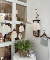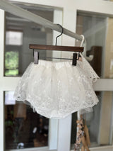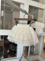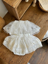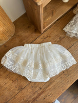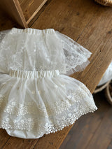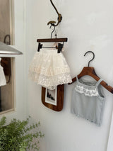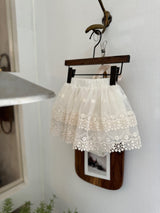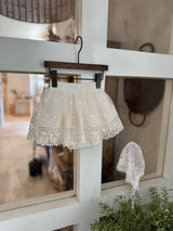It is a skirt bloomer with flower embroidery lace. The natural colour and the embroidery of the entire Sha skirt show a lovely and subtle charm.