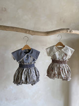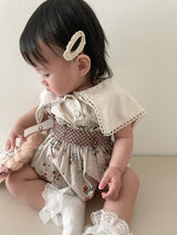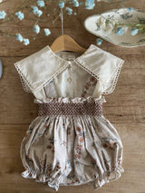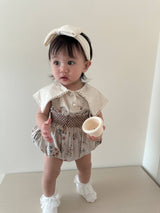 This adorable suspender romper features a vintage-inspired floral print and elegant hand-smocking details, creating a charming pumpkin silhouette. The gathered smocking at the hem adds volume for a playful fit. Made from soft cotton, it ensures comfort for little ones while looking irresistibly cute.