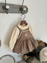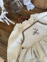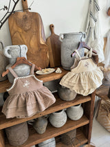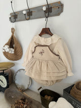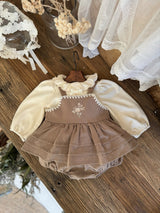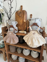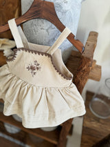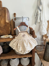 A charming suspender dress romper for babies, featuring delicate floral embroidery on the chest and beautifully finished embroidered detailing along the top.