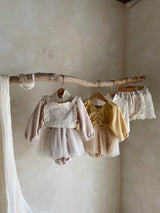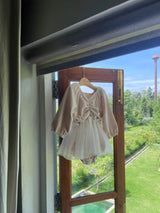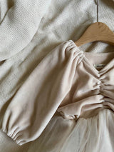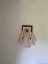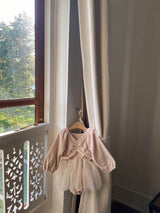 The romantic dress romper featuring soft coloured velvet and voluminous 3 layered tulle skirts. It looks like a little ballet suit. The rich shirring at V neck and puff sleeves are so adorable. This will be the perfect out fits for a special day and every day. There are snap buttons on crotch. The colour feeling like a cream color mixed with a drop of warm pink.