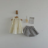 It is a sleeveless blouse that can be finished with a ribbon made from the shoulder straps. The blouse spreads out in an A-line, offering a comfortable fit. Wear it as a mini dress for your little one, and style it as a blouse as they grow. With its refreshing colour, you'll be the star of this summer.