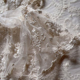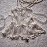This luxurious vest features delicate all-over embroidered lace with shiny gold accents and a scalloped hem for an elegant touch. The pearl button and organza ribbon on the back add a charming detail. It also adds a perfect and elegant touch to a simple dress.