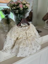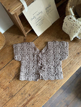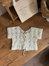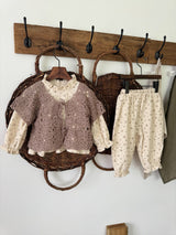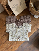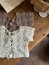 This unique cardigan is crafted with motif crochet, offering a light and soft texture. The long ties allow for a gentle closure, creating a calm yet charming look. Made with handmade knitting, it has a cozy, cottage-like elegance—just like something lovingly knitted by a grandmother. Produced in limited quantities.