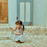 Adjustable blue ribbon shoulder ties add a sweet and playful detail.