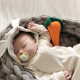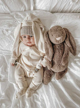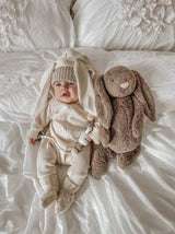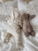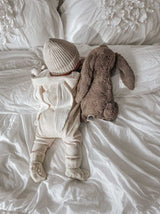 The cutest bunny jumpsuit for babies. Featuring the bunny ears at hood and a zip opening at the front for easy nappy change.