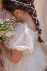 Soft layered tulle top with puff sleeves and flowing peplum silhouette adds a fairy-tale charm