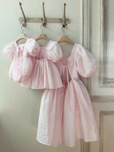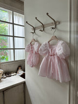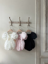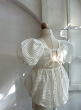 An elegant baby romper featuring voluminous puff sleeves and gathered details. Made from 100% cotton ripple fabric, it’s lightweight, breathable, and holds its shape beautifully without clinging to the body. Perfect for special occasions, this romper stands out with its stunning colors and luxurious feel. The open-back design with adjustable ribbon tie straps adds an extra touch of sophistication.