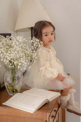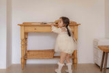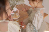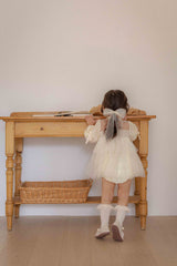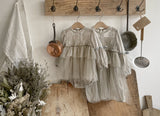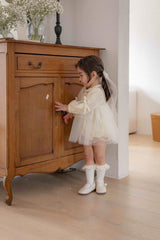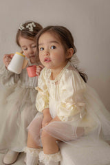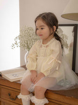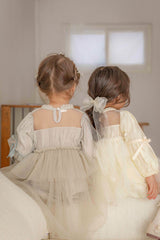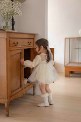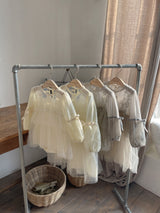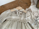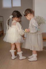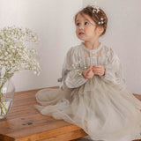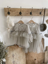 A girls' lace dress in a luxurious greyish-mint colour with a touch of vintage charm. The delicate lace ribbon trim on the sleeves and the voluminous shirring create an elegant silhouette. Featuring an intricate lace top and a beautifully layered tutu skirt, this dress is perfect for making any special occasion even more magical.