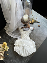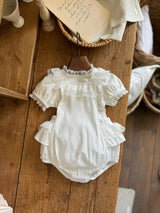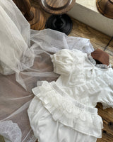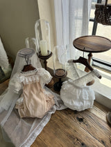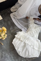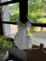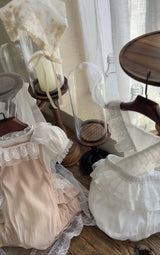 This lovely suspender romper features delicate lace and frills. The soft fabric provides a comfortable fit, gently hugging the body. Lace accents on the shoulder straps and the upper frill of the hip add a romantic touch, making it perfect for special occasions.