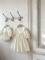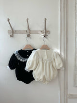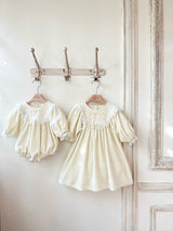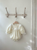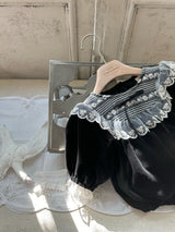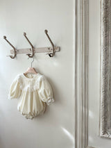 Designed with a gently gathered balloon silhouette, it features delicate vintage-inspired embroidery lace that gracefully frames the bodice, adding an elegant touch.