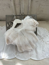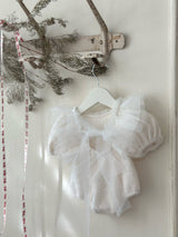 A delicate tulle frill drapes gracefully from the neckline to the back, adding a touch of sweetness and quiet elegance.