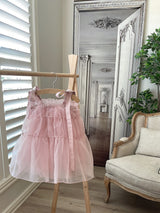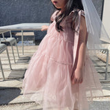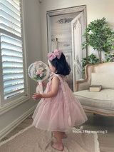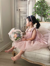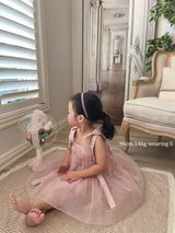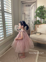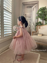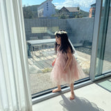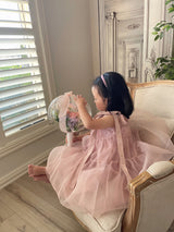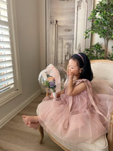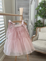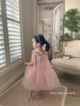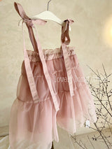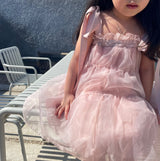 The lovely dress with voluminous skirts. The 4 layered tulle and oganza fabric make the lovely silhouette. It features the long ribbon strap details at shoulder. To create a rich volume, separate and lift up the tulle fabrics on the skirt one by one before wearing it.