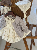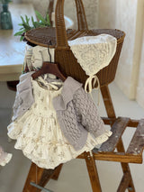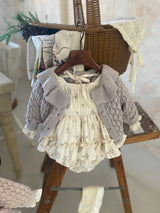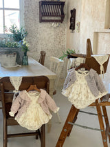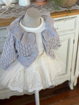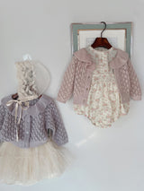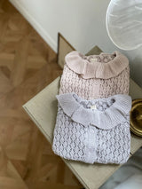 A luxurious knit cardigan with delicate crochet knitting. The beautiful colour palette and intricate texture add sophistication. The frilled neck collar with abundant shirring is also charming and cute.