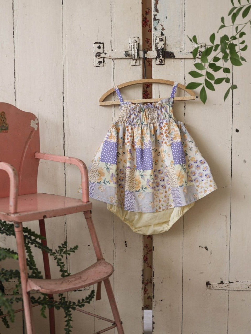 A charming baby romper with a patchwork floral print, designed to look like a sleeveless mini dress top with bloomers.
