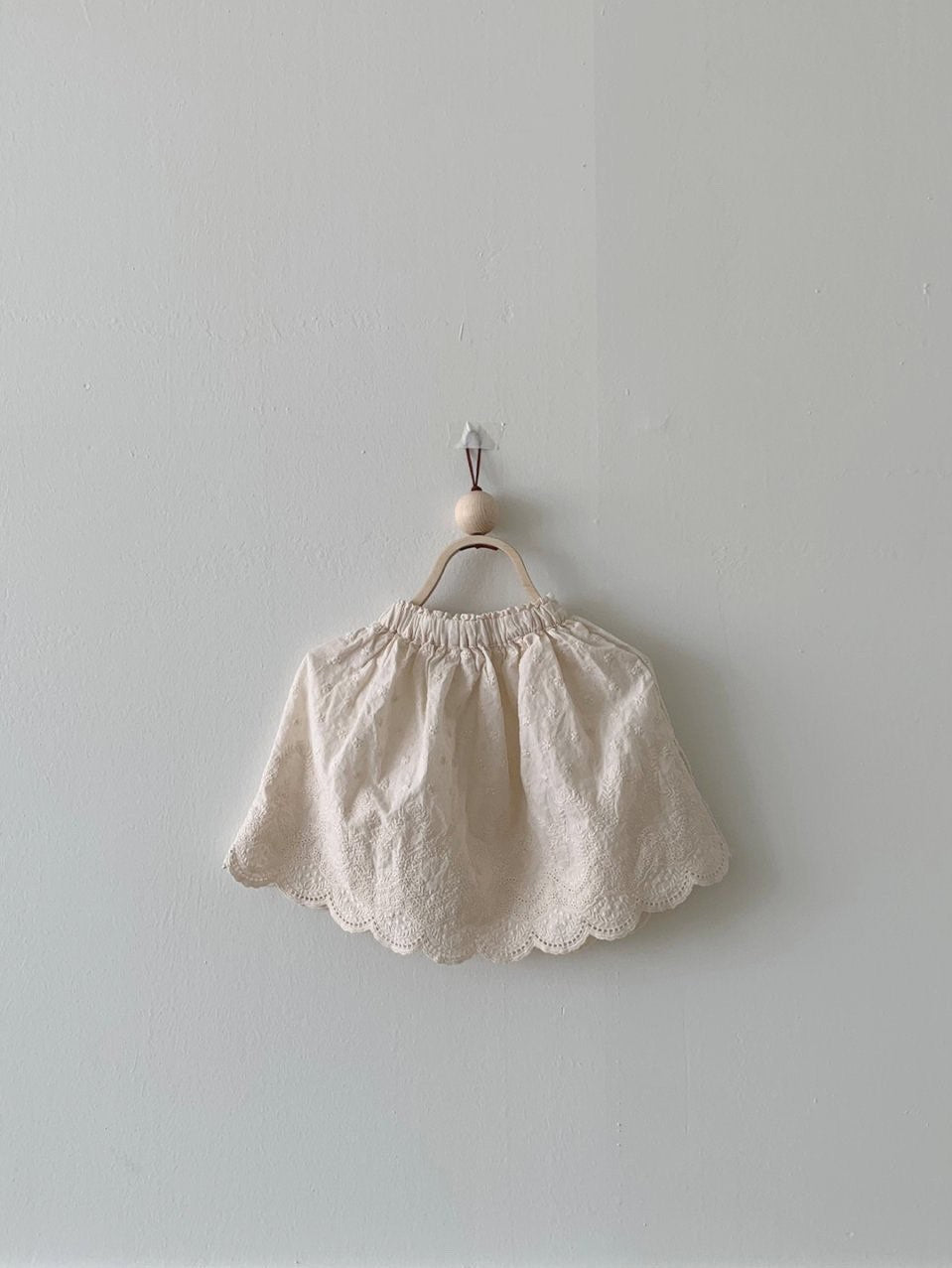 The neutral cotton lace skirt. The embroidery at scallop hem make the skirt more romantic.
