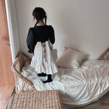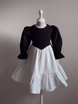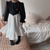 The timeless dress for girl. It features classic color match and romantic low V cut waist.
