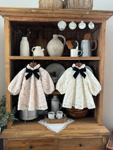 A lovely dress crafted from soft, warm floral lace that feels as cozy as it looks. The frilled neckline and removable black velvet ribbon add a charming, elegant touch. With its perfect balance of sweetness and sophistication, this piece is ideal for both special occasions and effortlessly stylish everyday wear. Available in two beautiful shades — a classic cream and a delicate beige-pink with a hint of blush — each one full of timeless charm.