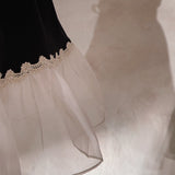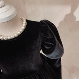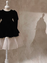 The gorgeous black dress featuring the luxurious velour fabric and organza frilled at skirt hem. The light beige organza makes voluminous skirt volume. The pearl buttons are also romantic. (The pearl necklace is not included)