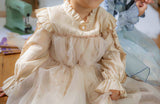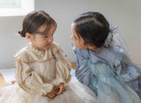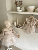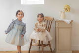 This dress is perfect for little girls with a touch of elegance. The top is made from a silky, lightweight fabric with a subtle sheen, while the bottom features a 100% cotton floral print, layered with a generous tulle lace overlay.