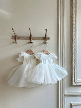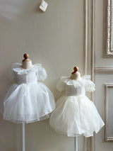 The enchanting girl's dress, crafted from a beautiful combination of organza fabric and cotton. The layers of organza fabric create a voluminous skirt and delightful puff sleeves.