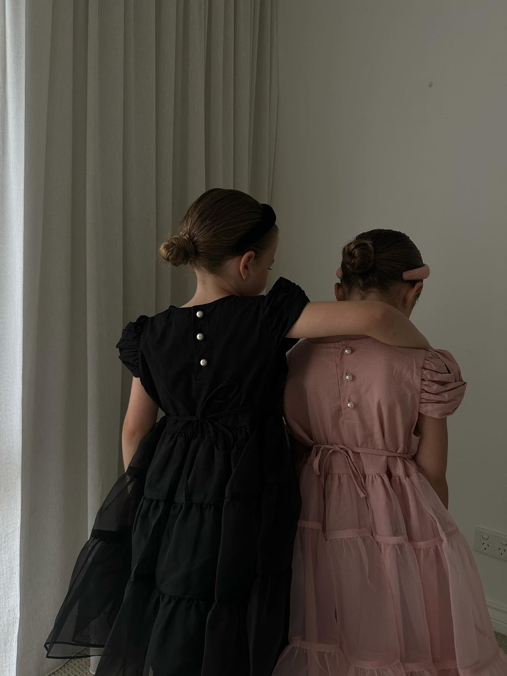 This is the perfect dress for little princesses. It features an incredibly voluminous 3-tier organza skirt that adds charm to the dress. The shirred and twisted sleeves on the shoulders, along with the pearl buttons on the back, give it a luxurious touch.