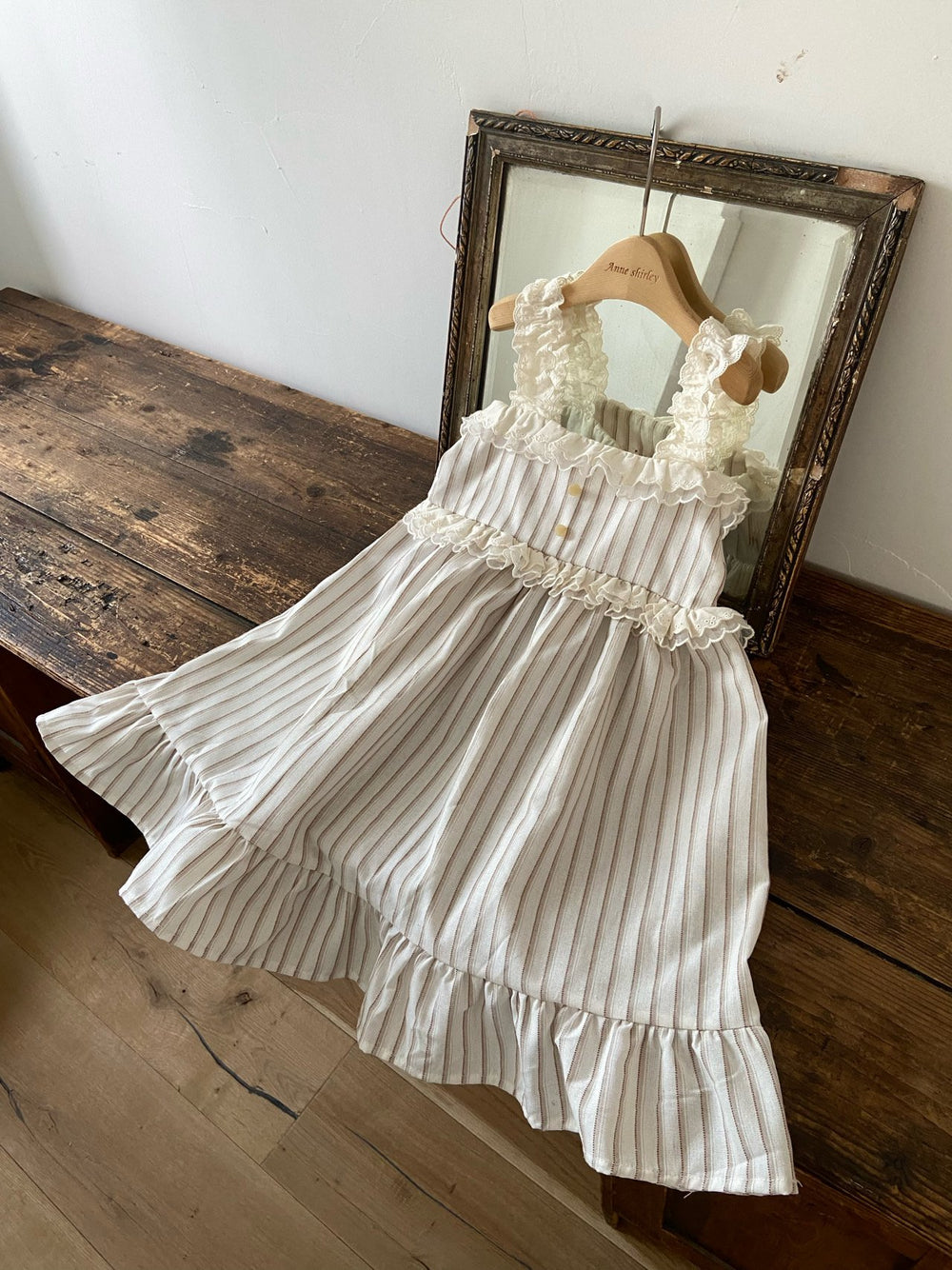 A classic striped girls’ dress with layered lace frill details across the chest and back, frilled waist, and shirred shoulder straps.