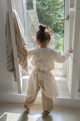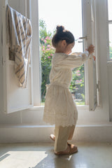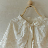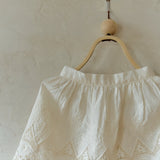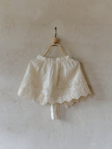 This adorable apron can be layered over any outfit to create a look that little girls will love, transforming it into a sweet lace skirt. Made from eyelet embroidered lace, the scalloped hem adds a charming vintage touch. Perfect for layering over dresses or pairing with leggings or jeans for a lovely, stylish look.