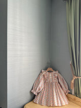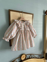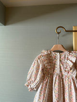 This lovely dress features a captivating vintage floral wallpaper print that brings timeless charm. The frill accents along the chest and petite ribbon details add a playful and delicate touch.