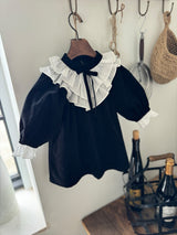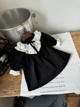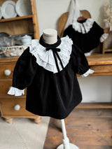 A timeless piece that captures the elegance of black and white. Made from soft, warm corduroy, this baby dress romper features cream frill details at the neck and cuffs, adding a graceful touch. The delicate ribbon at the neckline and the full frills enhance its refined vintage charm. Pair it with the matching baby suit for a beautifully coordinated sibling look.