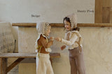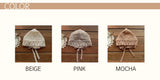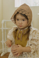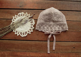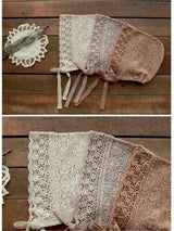 This delicate lace bonnet comes in neutral colors. It is available in sizes for babies and slightly larger sizes for children. Perfect for photoshoots or special occasions, adding an extra touch of cuteness.