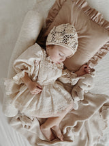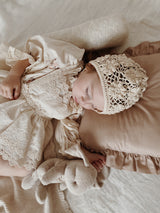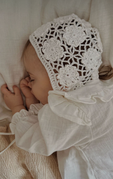 It's an exquisite handmade knit bonnet. All five colors are perfect for harmonizing with FW clothing. Try creating a warm and beautiful vintage look.