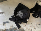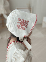 This elegant bonnet features delicate floral embroidery and intricate stitching along the edges, adding unique charm. Pair it with a matching romper or dress for a perfectly coordinated look.