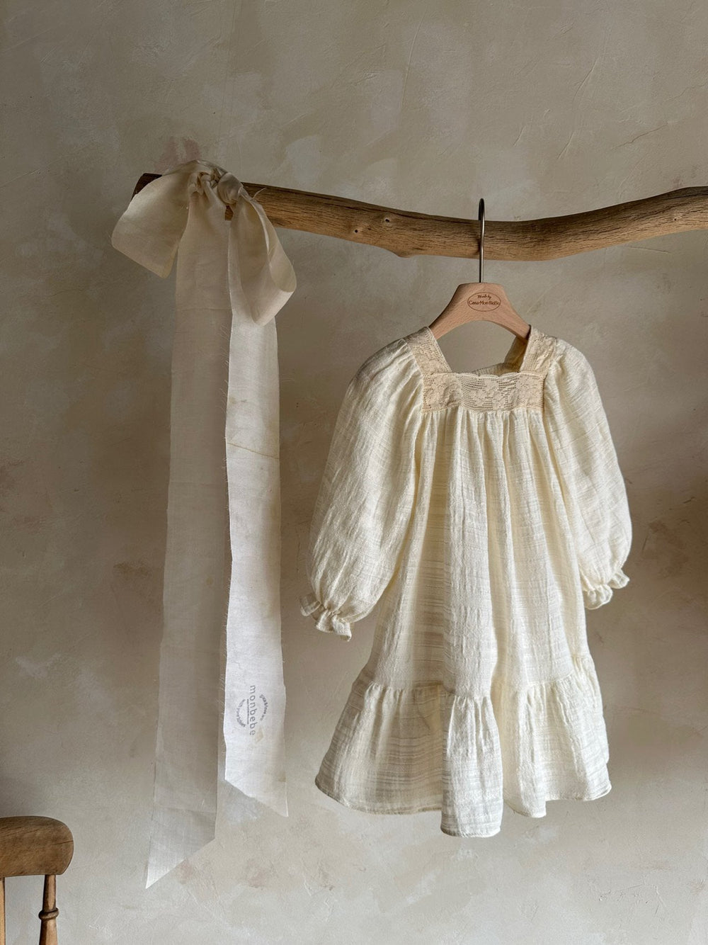Vintage-inspired girls dress in soft, muted tones with delicate lace detailing