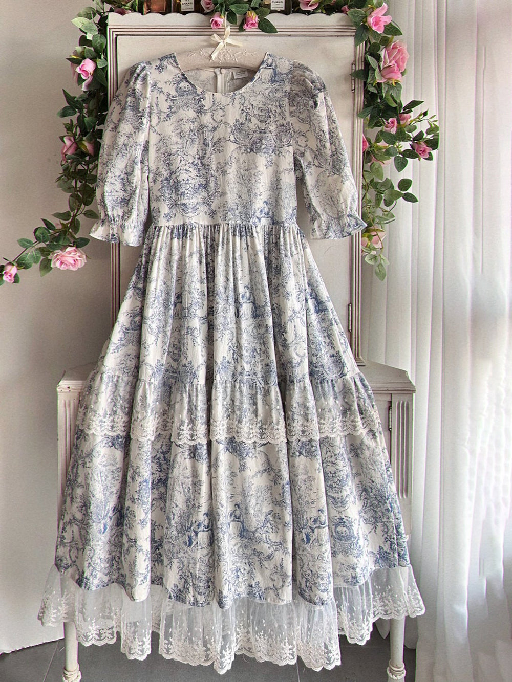 Romantic long dress with classic blue toile pattern and tiered silhouette