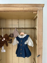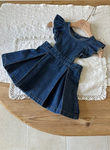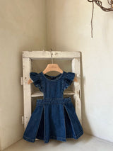 This adorable deep indigo denim dress for girls features frilled wing sleeves and a pintucked A-line skirt, offering a timeless and sweet look. The pintuck details on both the front and back help maintain the skirt’s lovely shape. It pairs beautifully with a vintage-printed blouse or a simple white tee, making it a versatile and stylish choice for any season.