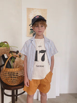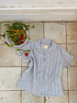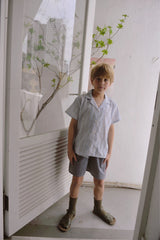 This striped shirt is perfect for both boys and girls to style elegantly. The open-neck collar design combined with the vintage-inspired natural stripes creates a stylish look. Made from cotton with a linen-like texture, this shirt stands out anywhere and is ideal for a cool summer day.