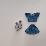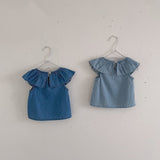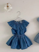 This denim blouse features an eye-catching, large ruffled collar. Made from lightweight, soft cotton, it’s perfect for cool, breezy styling. Matching color shorts are also available.