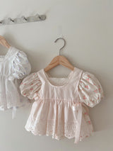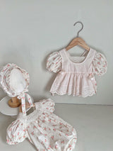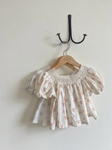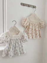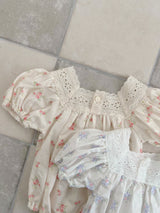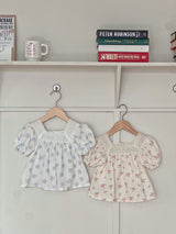 This charming girls' blouse features a small, vintage-inspired red floral print. The square neckline with eyelet lace detailing and the full, gathered shirring create an absolutely adorable look.