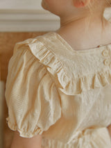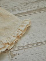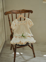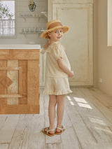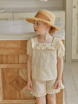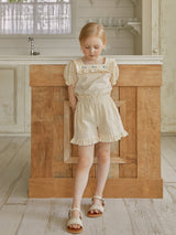 This blouse and shorts set is charming with its frill details and small, vintage-style rose accents. The square neckline with airy frills and puff sleeves adds a beautiful touch. Both the shorts and blouse are great for mixing and matching separately, but they look even lovely together. The wide elastic waistband ensures a comfortable fit for kids.