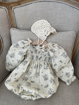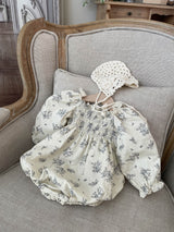 This romper showcases an elegant blend of smocked detailing and luxurious floral patterns, creating a refined and timeless look. The puff sleeves gently flare at the wrists, adding a delicate feminine touch, while the balloon silhouette offers both style and comfort. The smocked bodice beautifully shapes the upper body, enhancing its charm. Perfect for both everyday wear and special occasions, this piece exudes effortless elegance.