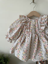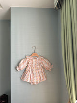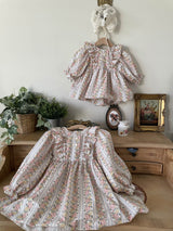 With a layered skirt that flares beautifully and soft puff sleeves, this piece is full of vintage-inspired loveliness. The built-in bloomer ensures comfort and freedom of movement, perfect for active little ones.