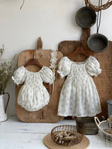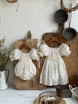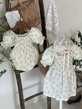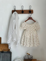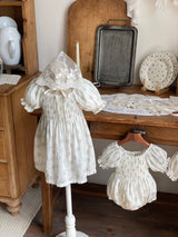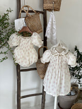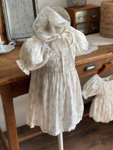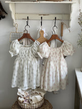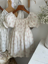 This dress features a breezy muslin fabric adorned with a beautiful floral print. The hand-smocked bodice and puff sleeves add a touch of charm, while its versatile design allows it to be worn off the shoulder for an effortlessly stylish look.