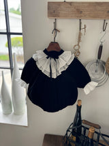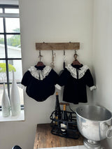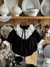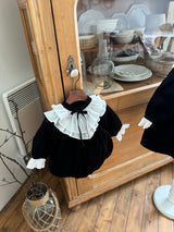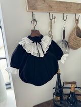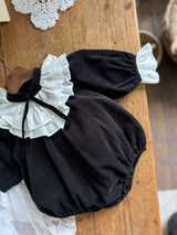 A timeless piece that captures the elegance of black and white. Made from soft, warm corduroy, this baby dress romper features cream frill details at the neck and cuffs, adding a graceful touch. The delicate ribbon at the neckline and the full frills enhance its refined vintage charm. Pair it with the matching big sister dress for a beautifully coordinated sibling look.