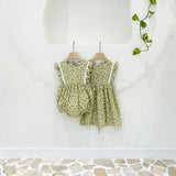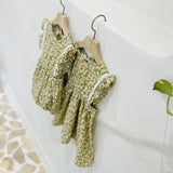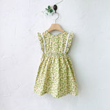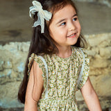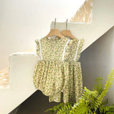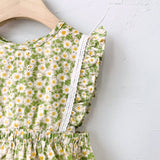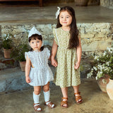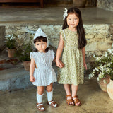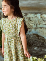 This girl's dress features a fresh floral print and eyelet embroidery fabric. The dress is adorned with charming floral patterns and delicate lace details. The wide side panels ensure a cool and comfortable fit. Perfect for wearing on its own during summer or layered with a blouse or t-shirt for a versatile look.