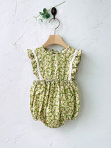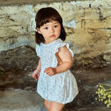 This baby romper features a fresh floral print and eyelet embroidery fabric. The romper is adorned with charming floral patterns and delicate lace details. The wide side panels ensure a cool and comfortable fit. Perfect for wearing on its own during summer or layered with a blouse or t-shirt for a versatile look.