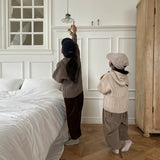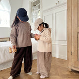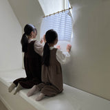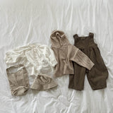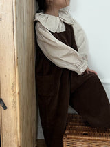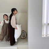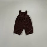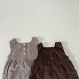 This overall is made from corduroy fabric, featuring warm, cozy colors. The loose, roomy fit allows for comfortable movement and provides ample space for layering thicker innerwear without feeling tight. The back button closure makes it easy to put on and take off, while the side pockets add an extra touch of cuteness. It's the perfect combination of style and practicality.