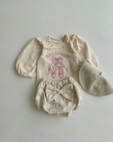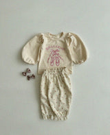 A charming girls’ t-shirt featuring a sweet ballet shoe print, perfect for little dancers! The delicate puff sleeves and soft pink print make it a must-have for everyday wear. Made from soft 100% cotton, it’s as comfortable as it is adorable!